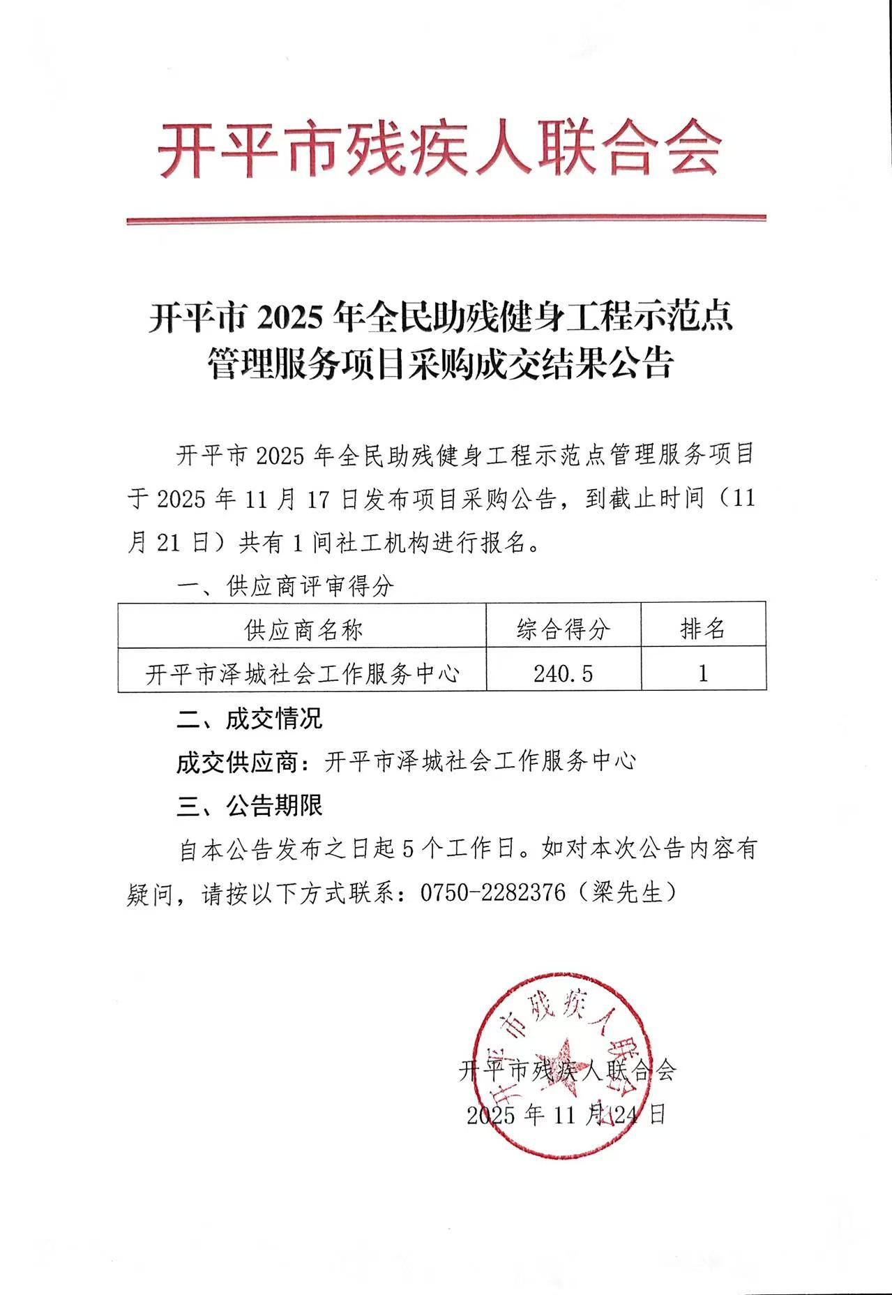 开平市2025年全民助残健身工程示范点管理服务项目采购成交结果公告