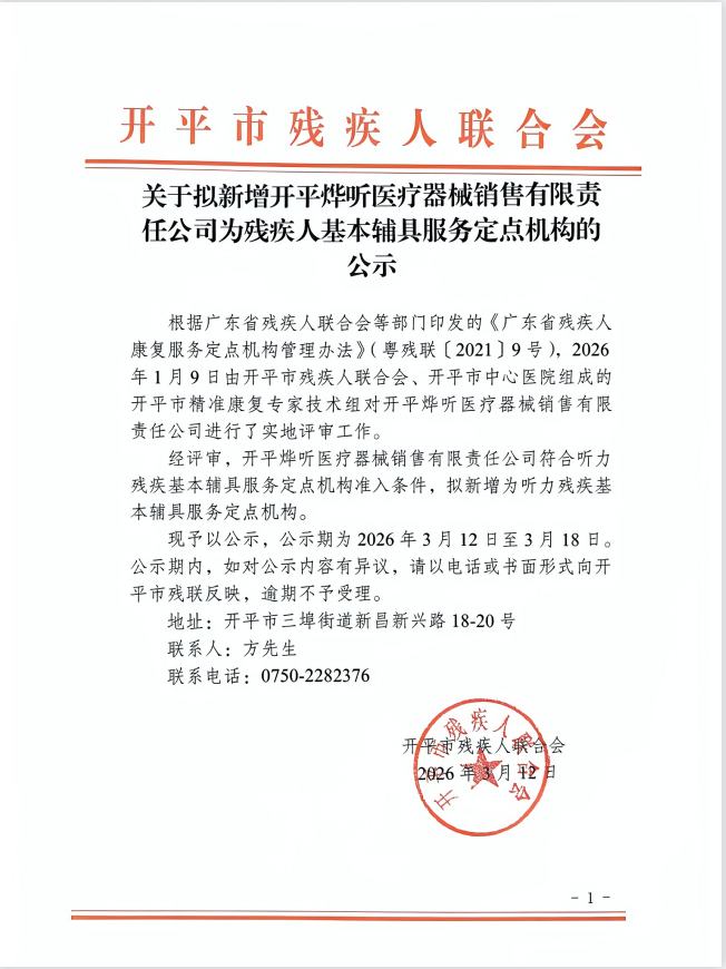 关于拟新增开平烨听医疗器械销售有限责任公司为残疾人基本辅具服务定点机构的公示