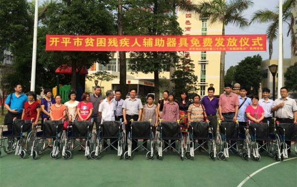 开平市副市长黄国忠等出席了贫困残疾人辅助器具发放仪式。据悉,开平市向贫困残疾人发放了第一批辅助器具,包括轮椅、儿童轮椅、盲杖、沐浴椅、气垫床、四角拐杖、坐厕椅等共97件,积极为贫困残疾人解决生活困难,同时希望通过系列活动,引起社会各界更多地关注残疾人及其家庭,营造尊重、理解、关心、扶助残疾人的良好社会风尚。