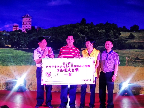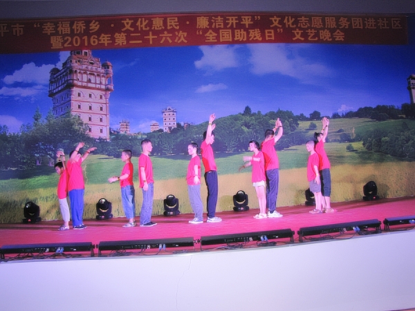 当天晚上,在市残联展能中心举行了文艺晚会,晚会上,残健同台演出,其中,开平市特殊教育学校学生表演的《虫儿飞》、《大雨小雨》,平市特殊儿童康复教育中心师生表演的《妈妈宝贝》,还有三埠中山社区康园中心残疾人表演的《彩虹的约定》和开平艺术团的精彩演出均获得了满堂彩。晚会同时还举行了“爱心助残、弘扬正能量助残善举捐赠仪式”,长沙商会、胡光辉、梁儒寿、儒良胡氏兄弟、张国雄等分别向长沙社区康园中心捐赠了空调;开平市福利彩票发行中心则向开平市特殊教育学校捐赠外出活动服装105套。