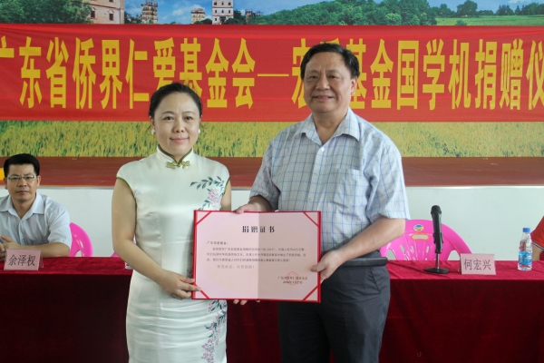 捐赠仪式上,广东省宏爱基金向开平市四所中小学捐赠了8台合计1.6万元的国学机;向开平市侨联、残联捐赠了100台合计20万元的助听器。