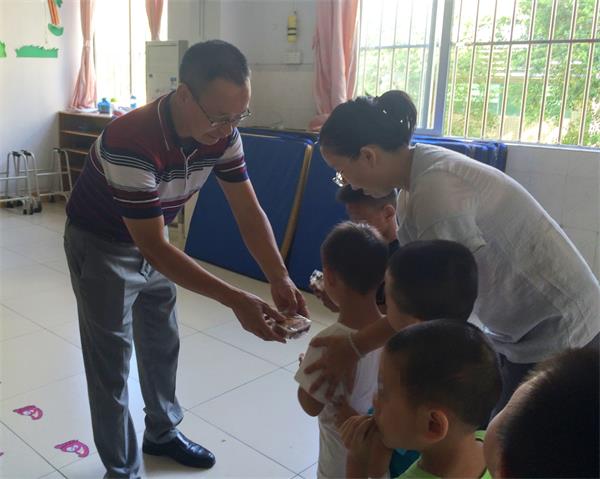 市残联理事长李树浓为市特殊儿童康复训练中心的小朋友派发月饼