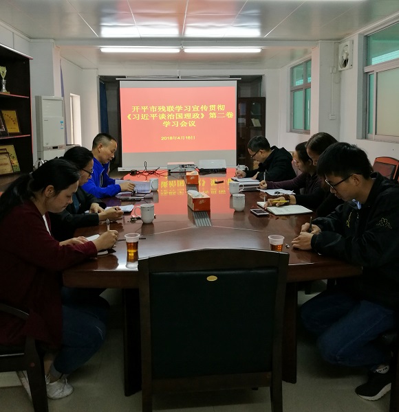 4月16日上午,开平市残联组织全体党员召开学习会议,传达学习《习近平谈治国理政》第二卷有关精神和内容。 学习会上,市残联理事长李树浓首先向大家介绍了《习近平谈治国理政》第二卷的主要内容;随后带领大家学习了第二个专题《决胜全面建成小康社会》的篇章,并节选了与残疾人工作密切相关的篇章《坚持精准扶贫精神脱贫打好脱贫攻坚战》的进行了解读和心得交流。