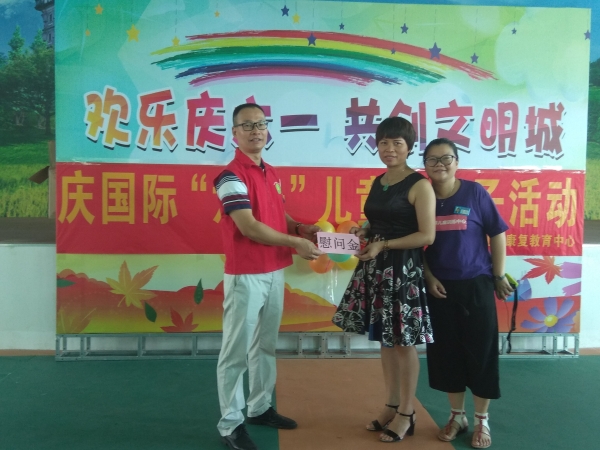 6月1日上午,开平市特殊儿童康复训练中心举行庆六一亲子活动。中心的老师、家长和学生们以及市残联的党员志愿者、中信保诚人寿保险公司的志愿者一起参加了活动。 活动开始,市残联理事长李树浓向中心送上慰问金和慰问品,祝福孩子们欢度节日。 随后,志愿者、老师和家长带领着小朋友们玩起了乌龟运球、钓鱼、跳圈圈、射龙门、阳光隧道、搭桥、双脚跳等游戏。