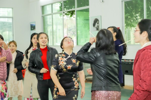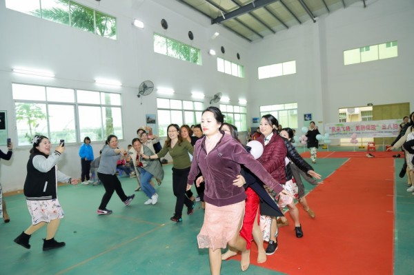“旗袍秀”后进入游戏环节,包含了“抢瓶子”、“指手画脚”猜词语、“顶杯子”、和“蜈蚣运球”等4个项目,整个游戏环节洋溢着欢笑,充满着喝彩与助威,充分展现了女性同胞们团结协作、奋勇争先奋斗精神。