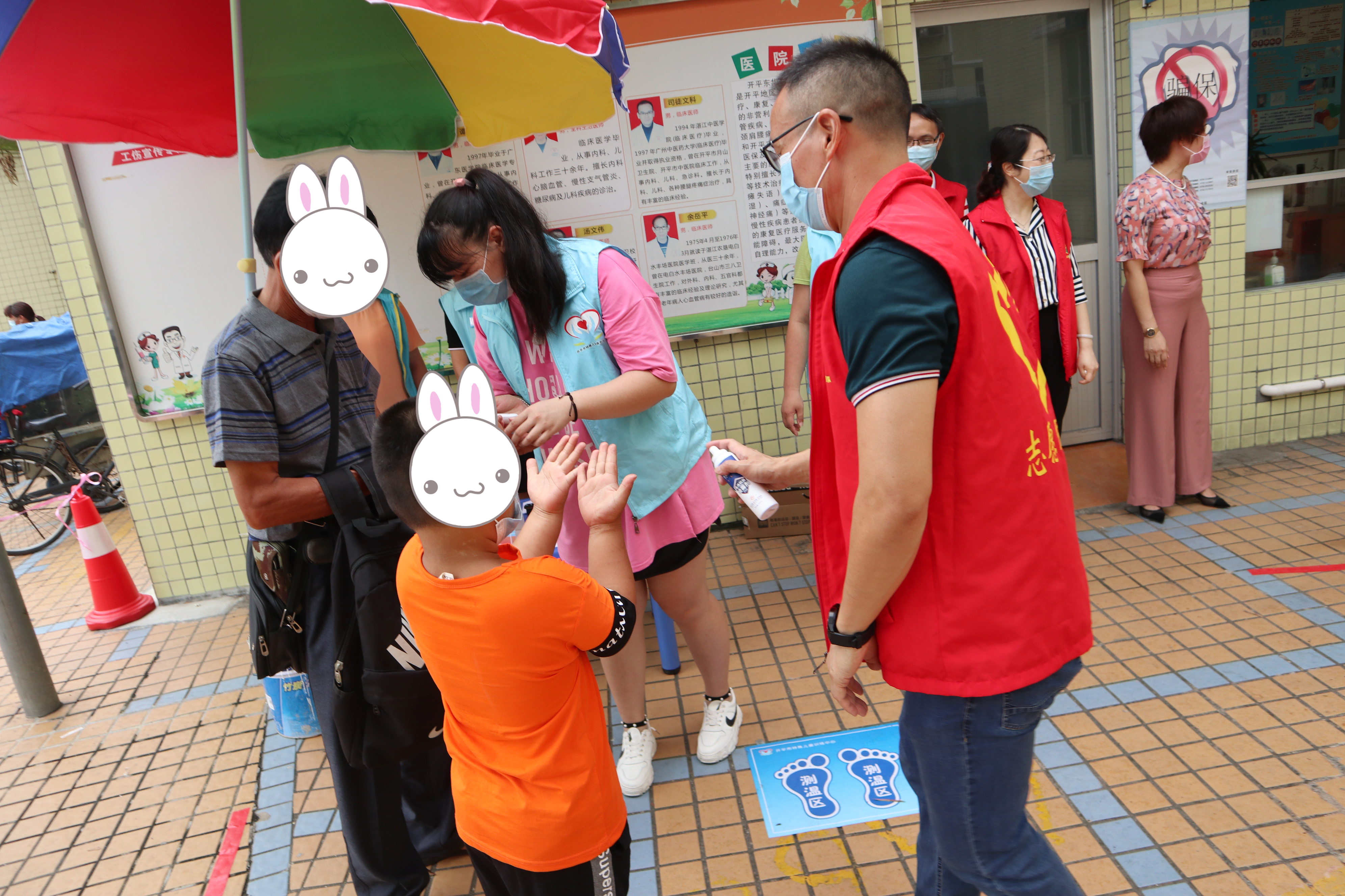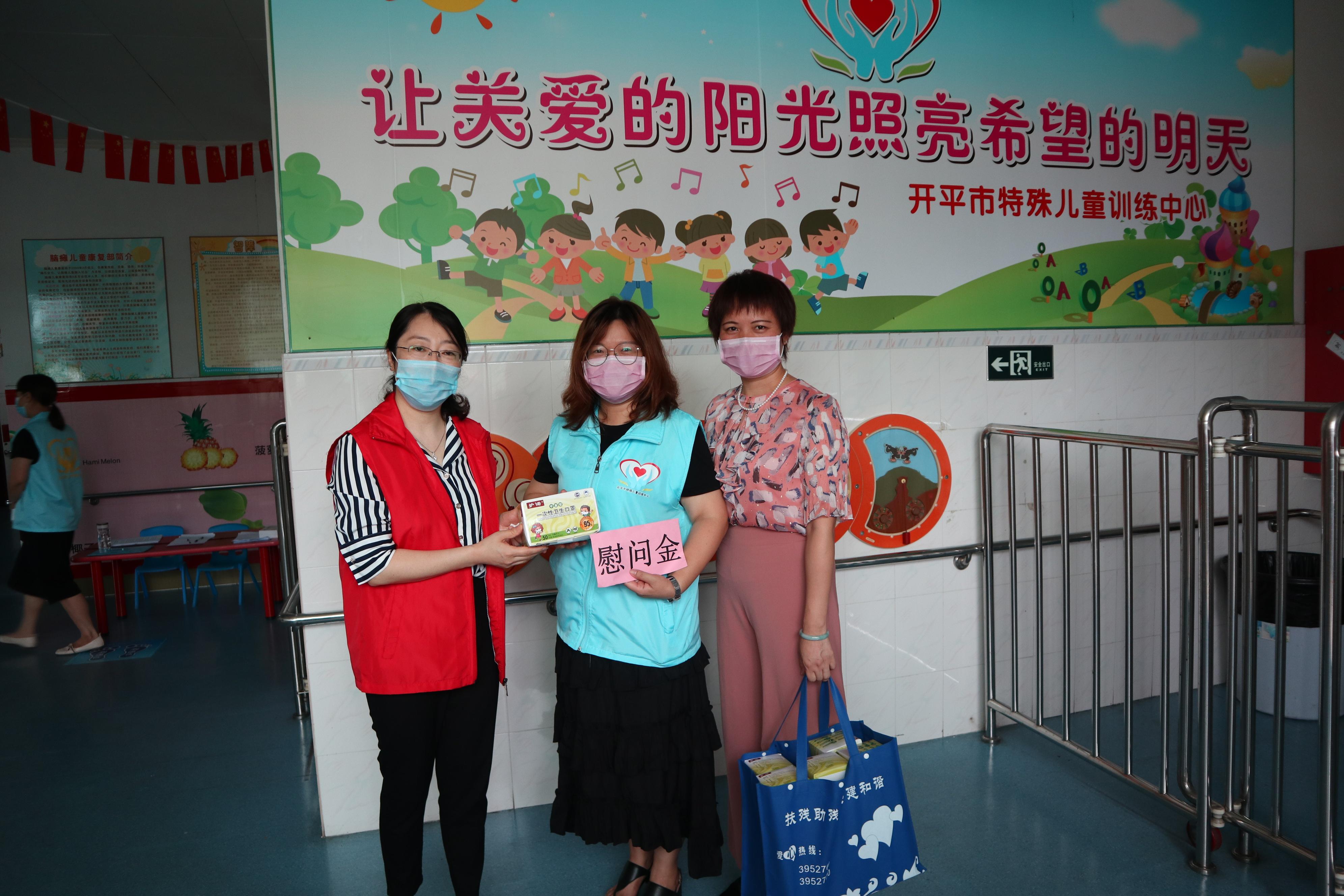 在检查之余,市残联还组织党员志愿者协助训练中心的老师们对返校的家长和学生进行消毒和检测体温,并向训练中心送上慰问金以及一批由江门市残联捐助的儿童口罩。