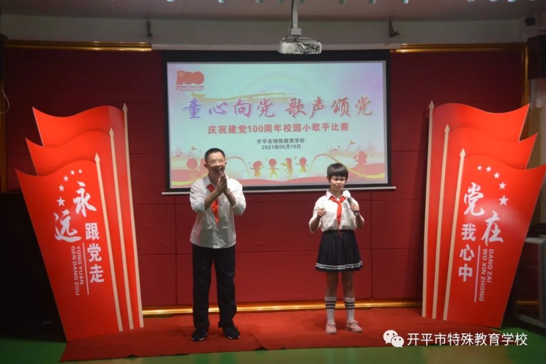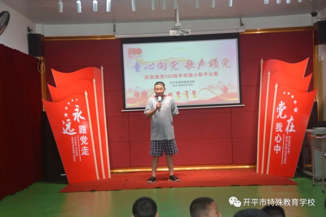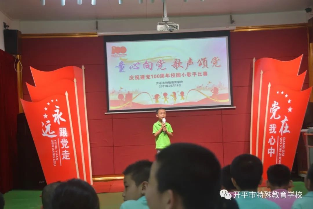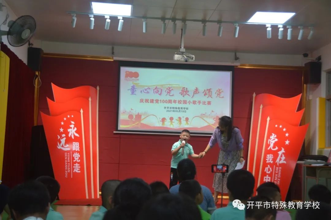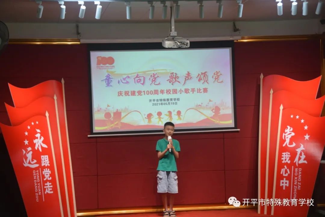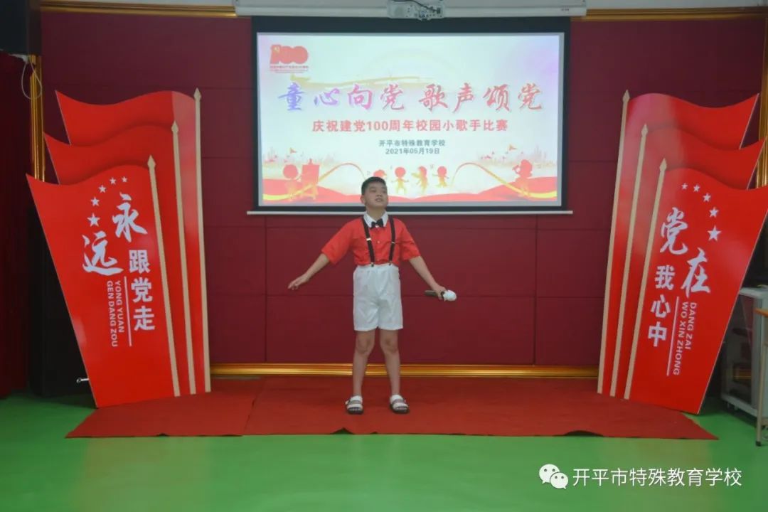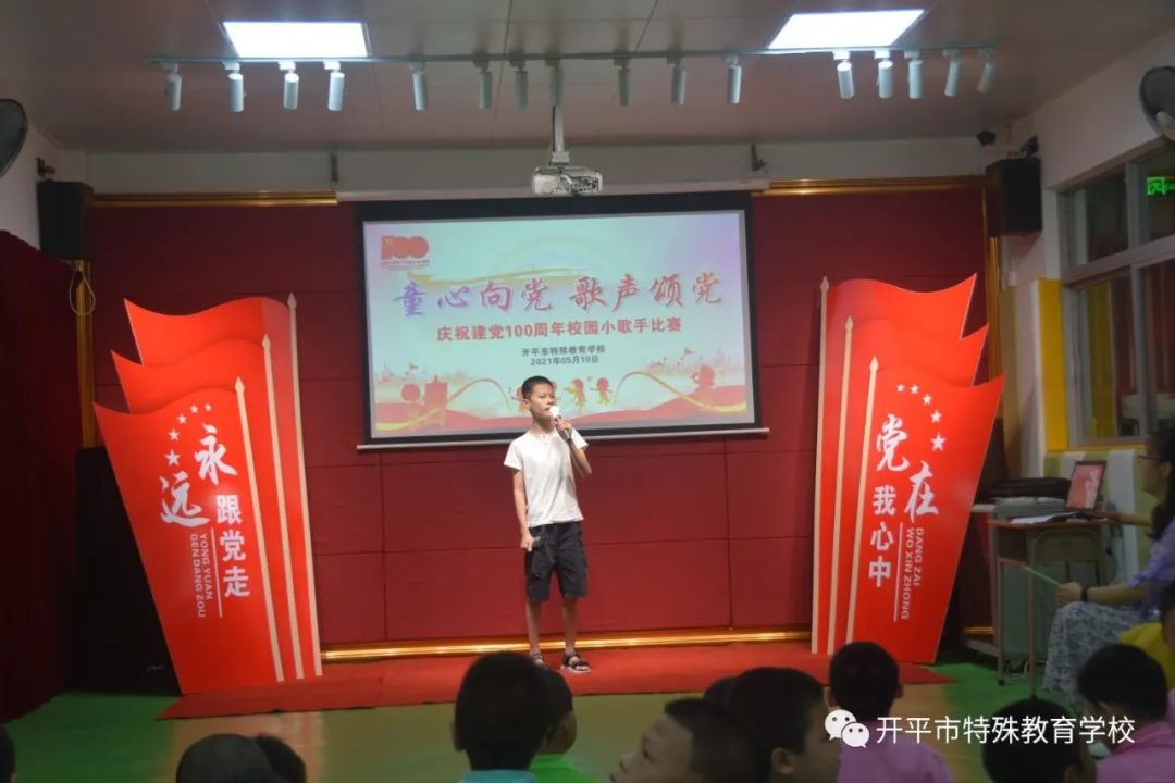 在中国共产党成立100周年来临之际,响应开平市教育局党史学习教育进校园的号召,培养学生热爱祖国的情怀和积极向上、朝气蓬勃的精神风貌。在2021年5月19日下午,“童心向党,歌声颂党”校园小歌手比赛在开平市特殊教育学校隆重举办。 百年征程波澜壮阔,百年初心历久弥坚 一首《我和我的祖国》节奏铿锵有力、音调振奋人心,引起了在场评委老师和观众的共鸣;《歌唱祖国》展示出铿锵豪迈、意气风发的爱国情怀,表达了对党和祖国的忠诚信仰和美好祝福;《我的中国心》让大家体验到浓烈的爱党爱国感情;《爱我中华》展现了学子们不忘初心,为实现中华民族伟大复兴的中国梦贡献青春力量的坚定信念。 小歌手们精彩的表演 胸怀千秋伟业,恰是百年风华。从1921年播下革命火种的小小红船,到领航复兴伟业的巍巍巨轮,在百年奋斗历程中,我们党领导人民取得了举世瞩目的辉煌成就,书写了波澜壮阔的历史画卷,留下了弥足珍贵的宝贵经验和精神财富。“没有共产党就没有新中国,他指引了人民解放的道路,他领导中国走向光明……” 回望来时的路,我们信念坚定;远眺前行的路,我们砥砺前行,“童心向党,歌声颂党”庆祝中国共产党建党百年红色歌曲小歌手比赛在全场师生们的掌声和欢呼声中圆满落下帷幕。 通过此次比赛,开平市特殊教育学校的学子们用优美嘹亮的歌声颂扬党的丰功伟绩,激发爱国情怀,祝愿祖国的明天更加美好!