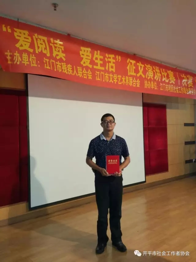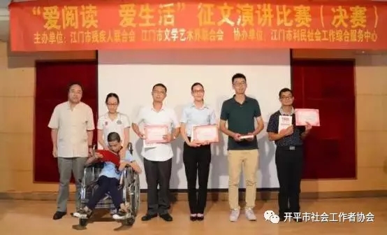 为弘扬社会主义核心价值观,倡导“全民阅读,书香五邑”,“爱读书,爱生活”的社会风尚,引导我市残疾人积极参与“全民阅读”,丰富其精神文化生活,协助其树立正确的人生观和价值观,培养“读书、益智、明理”的观念。开平市卫航社会工作服务中心组织康园中心学员参加了江门市残联举办2017年文化助残系列活动之“爱阅读,爱生活”征文演讲比赛。活动于2017年7月7日在上午在江门残联多功能厅顺利举行。