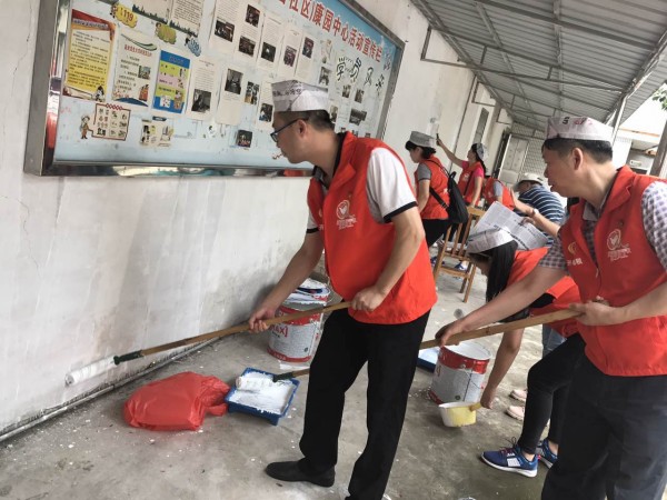 为了让党员义工对康园服务有更深入的了解,提升他们对学员的正面认识。社工带领义工们参观了康园,并向他们详细介绍了康园服务,随后义工们在社工的协助下分组进行场室美化志愿服务。虽然义工们都没有粉刷美化的经验,但他们都认真听取了技术人员的指导,相互探讨粉刷美化的技巧要点,努力做好场室美化服务。经过两个小时的努力,义工们已经汗流浃背。康园的工场、户外宣传栏、厕所等位置等在义工及学员们的努力下焕然一新,为学员们提供了一个美丽舒适的服务环境。