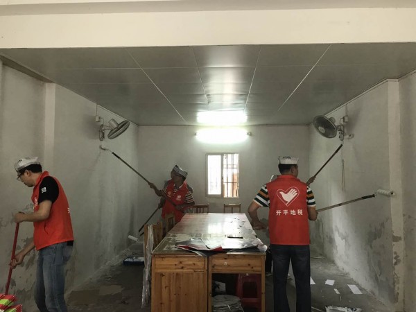 党员义工美化职业技能训练室的墙壁