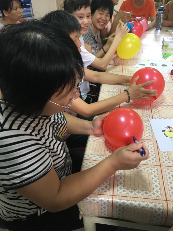 大家围成一桌,迫不及待地接过一个个缤纷多彩的气球,一气呵成地打起气,开始了属于自己的作画。他们手中的大头笔自由的挥动着,有的先是在长气球上认认真真的写下激励自己的一句句名言和自己的名字,还有的拿起了圆气球画起了各种小动物和花花草草......一时间,活动室内大头笔摩擦气球的呲呲声此起彼伏,连绵不绝。不一会儿,大家便拿起自己的杰作欣赏起来:那边的字写得工整有力,那边的小羊画的憨态十足,这边的小鸡才刚刚破壳而出,那边的向日葵已经绽出了灿烂的笑脸......