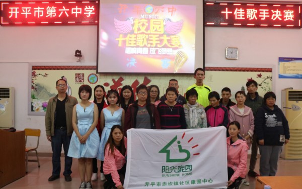 在残疾人康复方面,我国提出在2015年初步实现残疾人“人人享有康复服务”。康复,归根到底是使各种不能正常参与社会生活的人重新回归社会。为了完善社区康园中心针对残疾人建立的社会康复机制措施,让残疾人依靠自己的努力以及社会各界的帮助平等地参与社会生活,感受社会和谐发展的文化氛围,2017年12月28日,在开平市残疾人联合会、赤坎镇人民政府的支持下,赤坎康园组织学员参加由开平市第六中学举办的校园十佳歌手大赛活动。