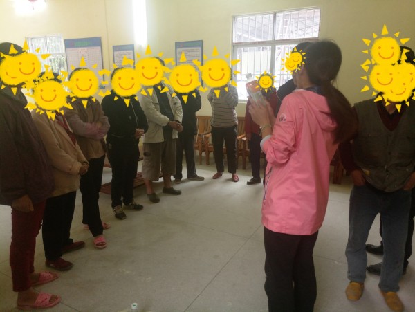 “根据瓶子上的问题指示,社工引导学员回答问题”