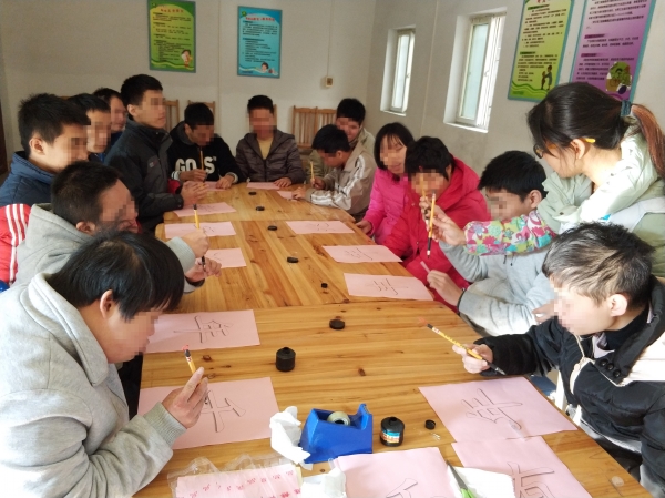 活动中,学员们踊跃的参与到书法描红中,社工手把手教导学员如何正确握笔手法,学员先从描红开始,每人都能写一张好字,大家都安静的沉浸在文化修养气息当中,描红完毕的学员帮助着其他学员,从旁鼓励他们。活动吸引着学员们的好奇心,从开始的一个字,到最后大家结合在一起,汇聚成一付对联,学员们心情都十分兴奋,看着自己的劳动成果,他们都非常高兴。
