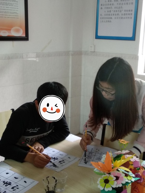 活动现场,社工先向学员们展示了毛笔的正确握笔方式以及每一个笔画的运笔走向,然后向学员们分发工具以及描红纸。学员们在社工的指导下,纷纷拿起笔,认真地描写每一个字。在描写的过程中,有些闹腾的学员都难得安静了下来,认真的描好每一个字,遇到不会的还时不时向社工提问,让社工十分惊喜,学员们纷纷向社工表示很喜欢写字和学习。