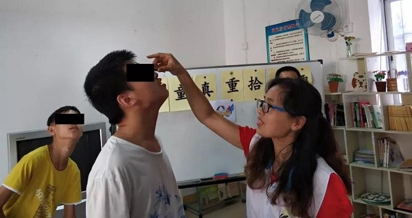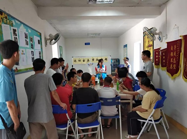 学员们津津有味地听社工讲解儿童节的由来知识 活动分为:儿童节由来介绍、学员表彰总结及游戏互动三部分。活动开始时,卫航社工通过向学员提问对“六一”儿童节的认识,向学员们介绍了儿童节的知识,学员们你一言我一语,对于社工的介绍也听的津津有味,现场欢笑声不断;在学员表彰总结及游戏互动环节,社工就5月份行为表现积极的学员颁发表扬信及礼品。学员们为受表彰学员送上掌声和祝福。 社工向表现好的学员颁发表扬信 游戏互动环节再一次把活动推向了高潮,社工通过“开心合作”、“我能吃”两个游戏,以分组合作竞赛的方式,促进学员们参与的积极性。 “开心合作”游戏让学员用指尖传达数字,另一学员感受这个来自背部的力量,一个一个地传递着,最后一名学员讲出了大家在背上写出的爱心数字;“我能吃”在学员的脸上放一个饼干,学员们通过调整面部表情、抖动等一系列动作,最后让饼干成功送到自己的嘴里去。学员们使出运身解数的力量,现场欢笑声和喝彩声不断。 “开心合作”来自背部的传递 “我能吃”充分发挥学员的面部表情能力 美好的时光总是稍纵即逝,活动给学员们留下了满满的喜悦和收获,同时也帮助他们“重拾童趣,重返童真”,欢度一个愉悦、有意义的“六一”国际儿童节。