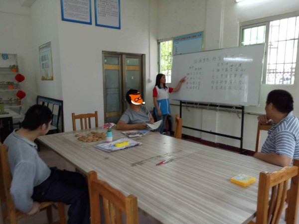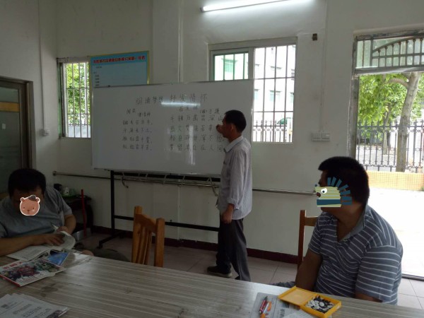 活动主要分为社工领读环节与学员们自我展现环节两部分。首先是社工领读环节,管理员带领着学员们朗诵《悯农》、《石灰吟》,管理员读一句,学员们跟着重复一句,朗诵过程中学员与社工之间配合的十分默契;领读几遍过后,紧接着的是学员们自我展现环节,台前学员们抑扬顿挫、充满感情的吟咏、朗诵,仿佛把我们带进了诗的意境,书的花园。在优美隽永的字里行间,升华了在场所有人的情感,触动了我们的灵魂,陶冶了我们的情操,给予了我们心灵的震撼和美的享受。